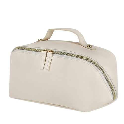 Soft PU toiletry bag, with a wide opening main compartment. With matching PU zipper pulls and golden zipper. Interior with double compartment and additional zippered pocket.