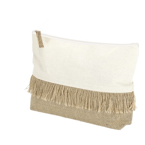 Toiletry bag made of laminated jute and natural cotton. With distinctive fringes, natural-colored zipper closure, and jute puller.