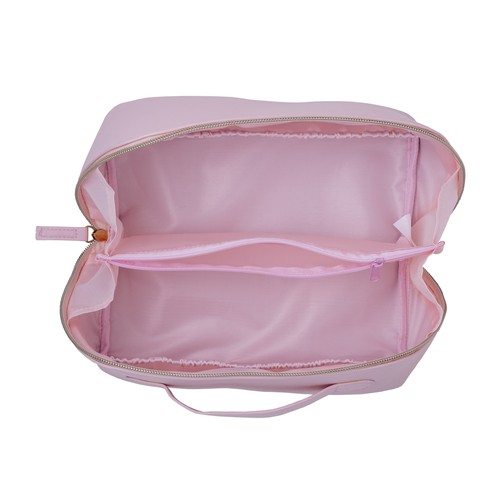 PU travel beauty case. Features zippered closure, two interior compartments, a central zippered pocket, three small elastic side pockets, and a convenient exterior handle