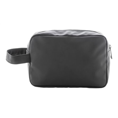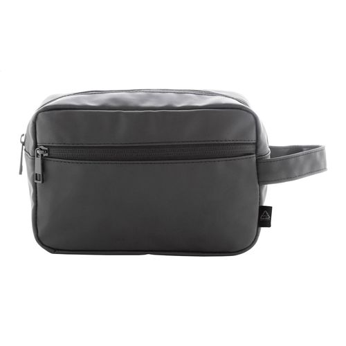 Soft recycled PU leather cosmetic bag with two zipped compartments and carry handle. With distinctive recycled PU label.