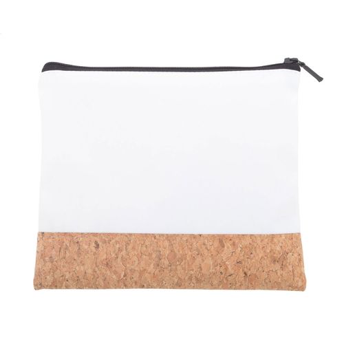 Custom made, zipped cosmetic bag in polyester and natural cork. With all-over sublimation printed graphics. MOQ: 50 pcs.