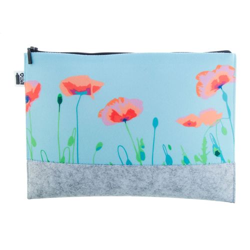 Custom made, zipped cosmetic bag in RPET felt with all-over sublimation printed graphics. With distinctive RPET label. MOQ: 50 pcs.