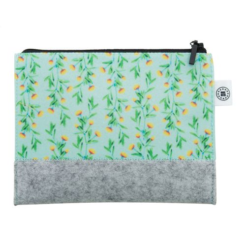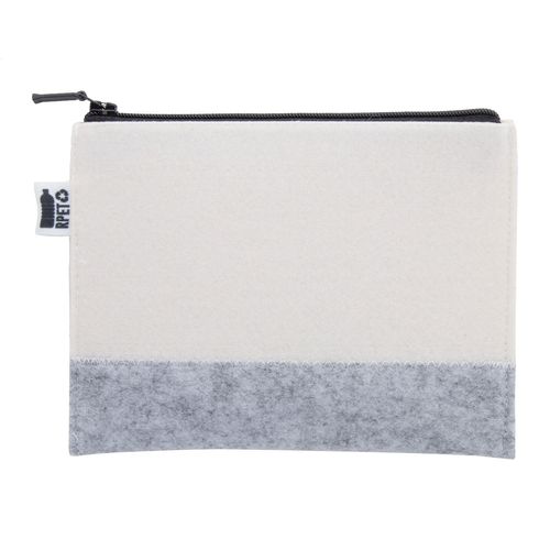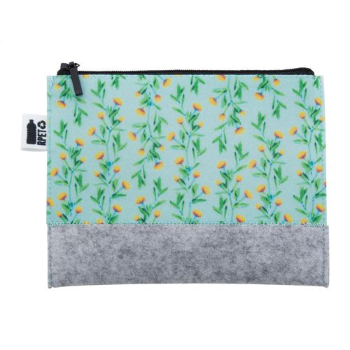 Custom made, zipped cosmetic bag in RPET felt with all-over sublimation printed graphics. With distinctive RPET label. MOQ: 50 pcs.