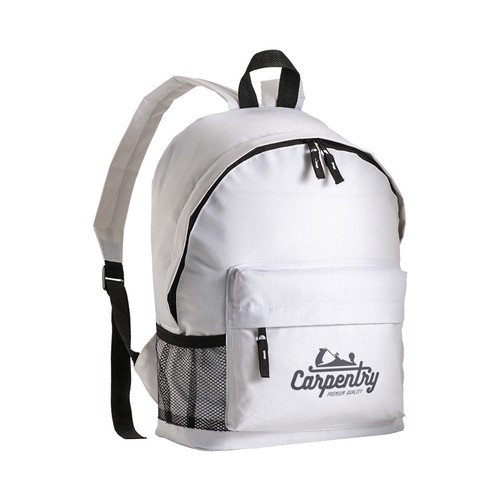 600D polyester 3-pocket backpack (one mesh side pocket). Adjustable shoulder straps and padded back