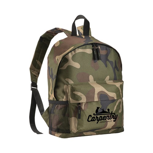 600D polyester 3-pocket camouflage backpack (one mesh side pocket). Adjustable shoulder