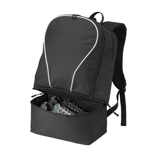 600D polyester sports backpack, large main compartment and padded shoe compartment.