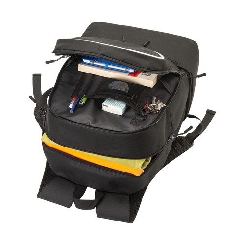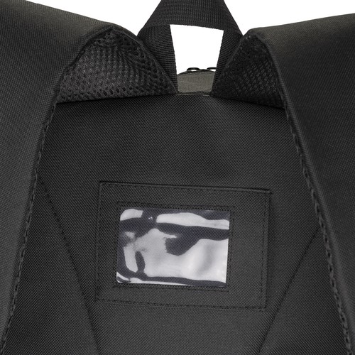 600D polyester sports backpack, large main compartment and front accessory pocket. Adjustable padded shoulder straps and padded shoe compartment. With transparent label pocket on the back.
