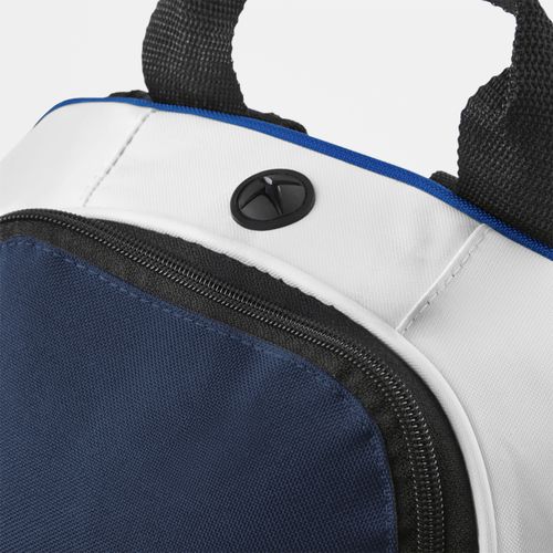 Teamwear Backpack. 600D/420D Polyester. Media pocket and headphone port. Enhanced visibility reflective piping. Water bottle pocket. Zippered front pocket. Zippered side pockets. Internal mesh pocket. Padded back panel. Padded adjustable shoulder straps. Grab handle