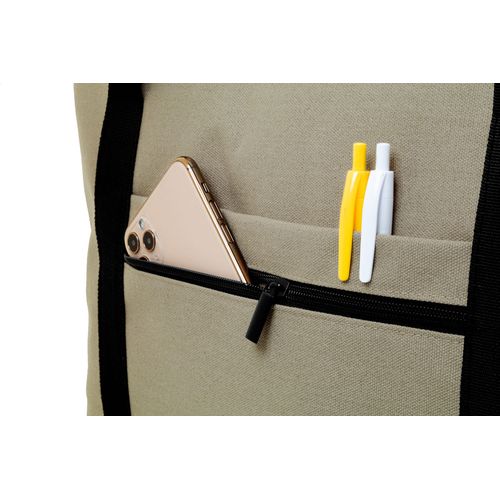 Recycled canvas travel / sports bag with zipped main compartment, front pocket, adjustable shoulder strap and zipped back pocket which doubles as trolley strap. 70% recycled cotton and 30% RPET polyester. With distinctive recycled cotton label.