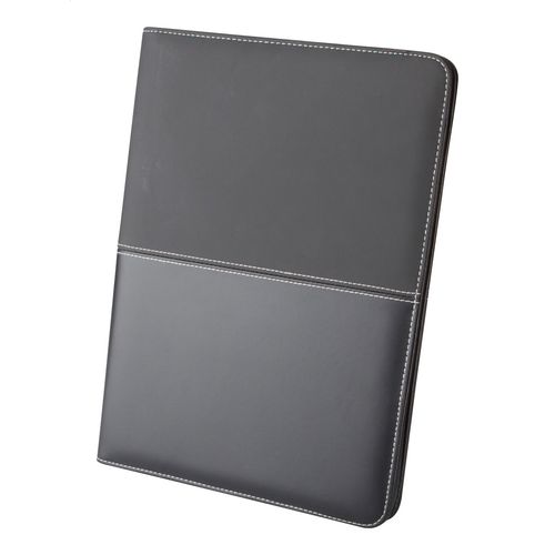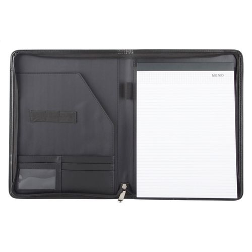 A4 sized, PU leather zipped document folder with 20 lined sheets notepad, pen and business card holder.