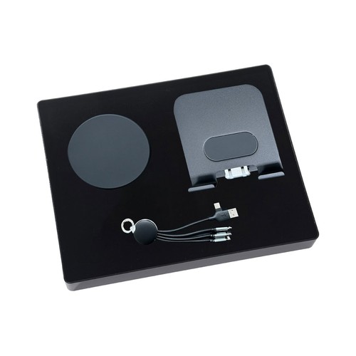 Perfect for clients and employees,this Customized Gift Set blends utility with sophistication,making it an excellent promotional choice. The set features a desktop phone/tablet stand,a wireless charging stand,and a multi-charger cable—essential tools for both professional and personal use.