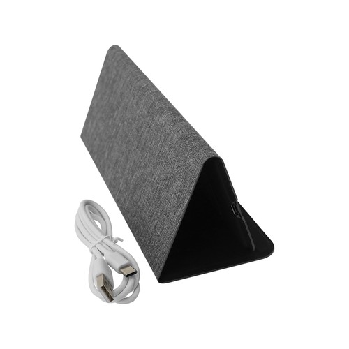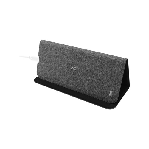 Foldable mouse pad with wireless integrated charger of 10W. Made in RPET polyester and metal. With RPET certificate.