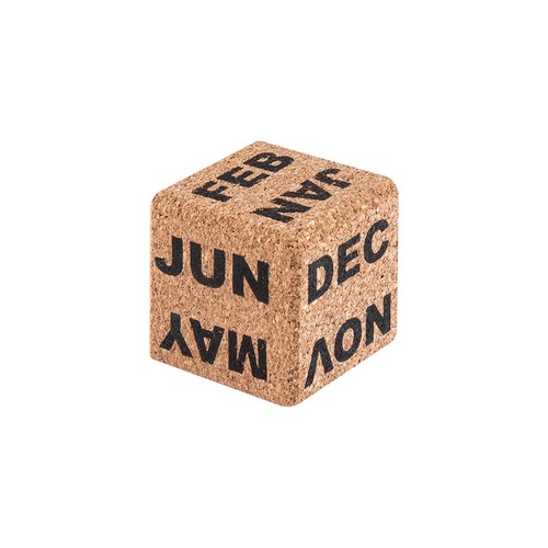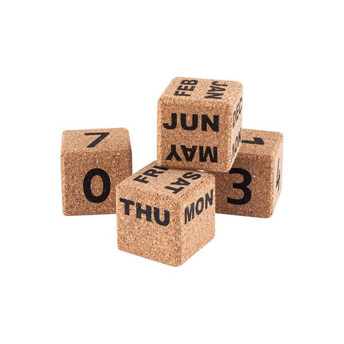 Calendar made of natural cork, contains 4 cubes and a rectangular base for easy handling.