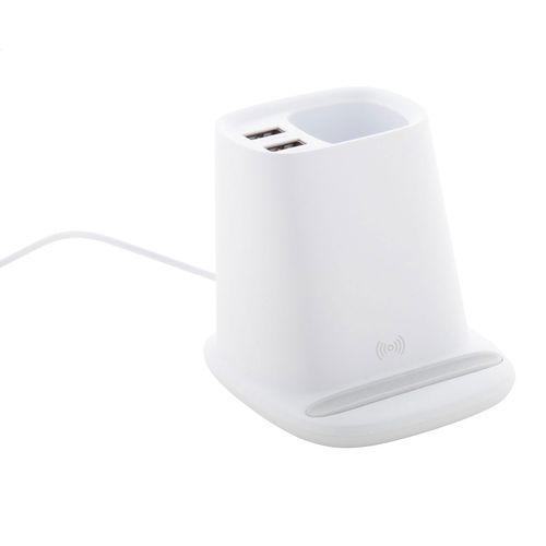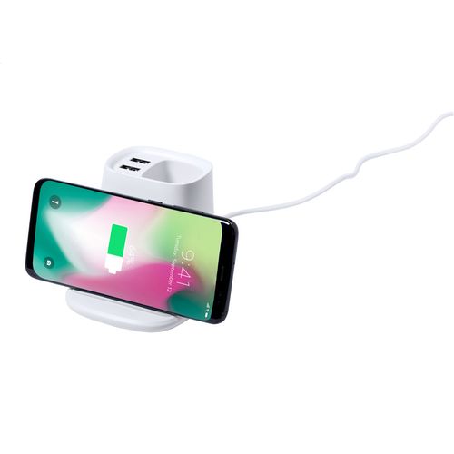 Multifunctional desk pen holder in plastic with phone holder, built-in wireless fast charger (10W) and 2 USB charger ports (max output 2000 mA). Including USB charger cable.