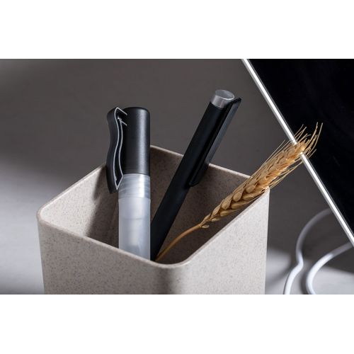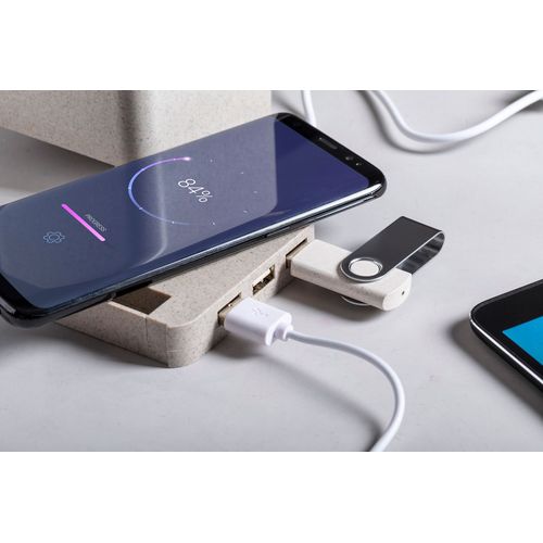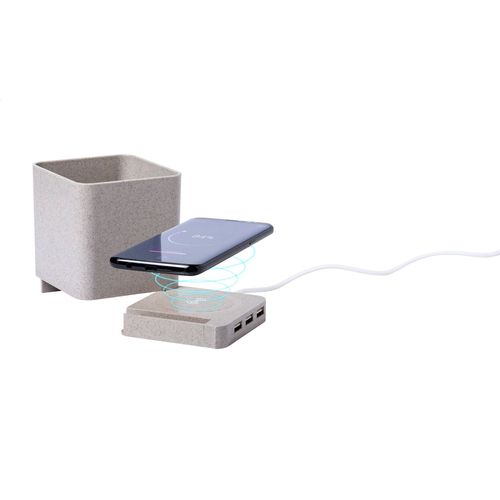 Multifunctional pen holder in ecological wheat straw plastic with mobile phone holder, wireless charger (5W) and 3-port USB hub (USB 2.0). Including USB charger cable.