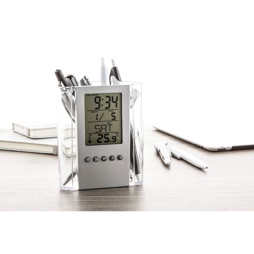 Transparent, plastic pen holder with digital display, thermometer, clock, alarm and calendar functions. Delivered with button cell battery.