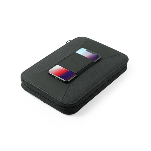 All in one power bank organizer in PU leather and polyester 300D materials combination. Wireless charger integrated in cover, with smartphone holder. Including integrated, auxiliary battery of 4,000 mAh charging capacity. In sober design, with zipper closure and including a 64 sheet notepad with stripped layout, ball pen holder and cardholder. USB output, with micro USB cable included an presented in an elegant white box. The capacities shown in all our external auxiliary batteries are real, all of them incorporating non-recycled, grade A batteries, with a service life of at least 500 charging cycles, and complying with CE regulations. In addition, they are manufactured according RoHS standards, and in compliance with the following safety requirements: Power bank overcharge protection system. Complete discharge protection system, which increases the durability of the power bank. Blocking system to prevent short circuits. Constant charging transfer system, in accordance with t