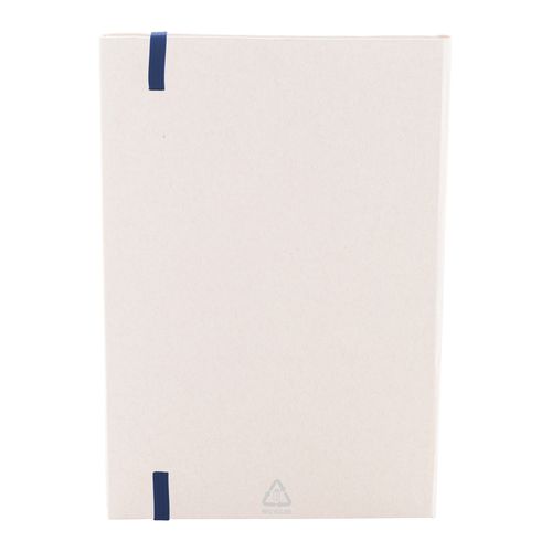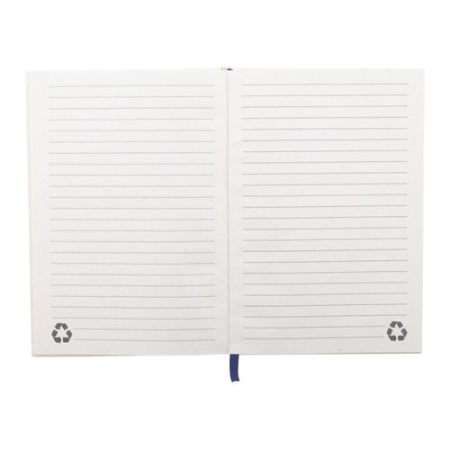 Recycled milk carton paper notebook with hard cover, 80 lined sheets and matching colour elastic band. A5 size.