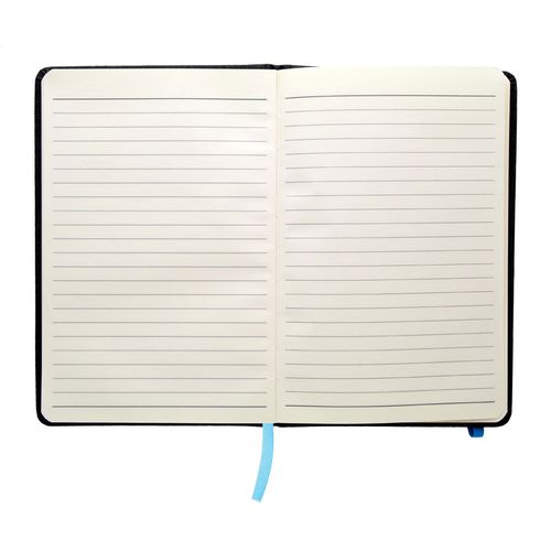 Textured PU leather covered notebook with matching bookmark, rubber band and pen holder. 96 lined sheets, A5 size.