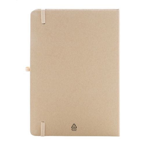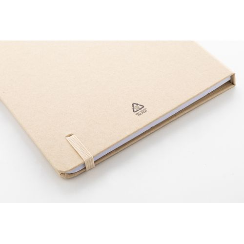 Recycled cardboard covered notebook with 70 blank sheets in recycled paper. The inside cover includes 25 sticky notes, 125 page markers and a card holder pocket. With rubber strap and pen holder. A5 size.