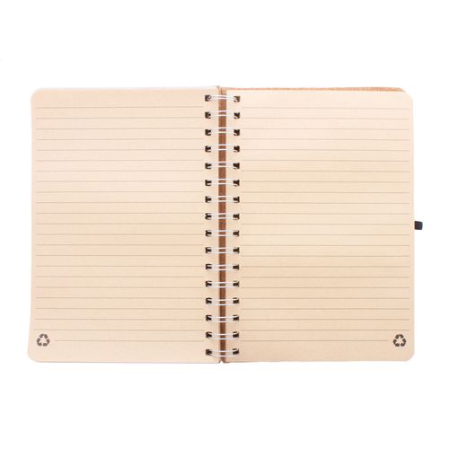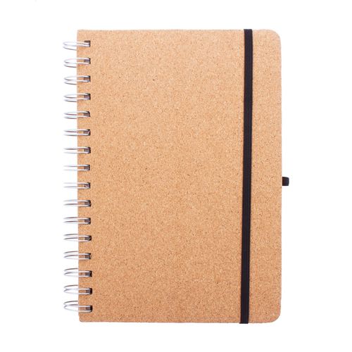 Natural cork covered spiral notebook with wheat straw plastic mobile and tablet holder insert. With 70 lined sheets in recycled kraft paper, rubber strap and pen holder. A5 size.