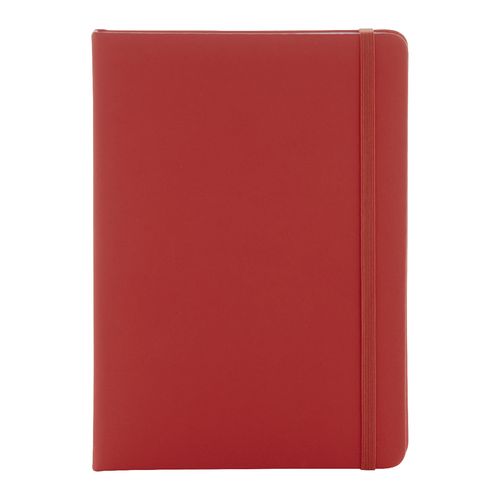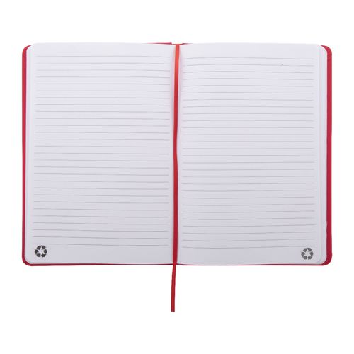 Recycled PU leather covered notebook with 100 lined sheets in recycled paper. With matching colour bookmark and rubber band. A5 size.