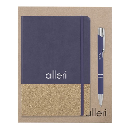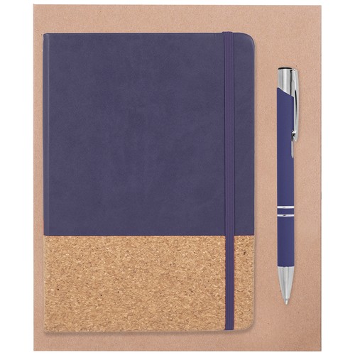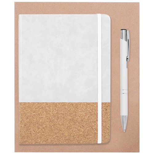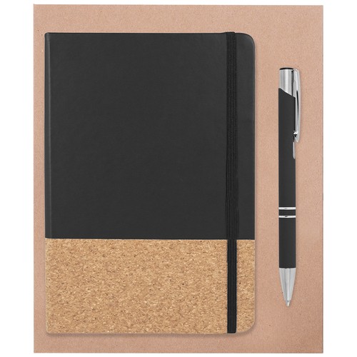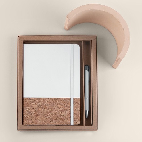 Set of notebook with cork and pen with rubber finishing, presented in kraft cardboard box. If you order it without branding, the kit is not assembled. If you customise it, we will prepare your kit for you.
