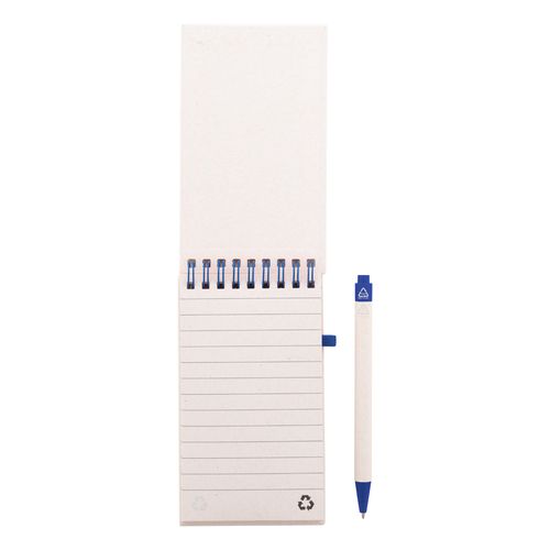 Recycled milk carton paper spiral notebook with hard cover and 70 lined sheets. With matching colour spiral rings, rubber strap and pen holder. Including recycled milk carton paper and recycled ABS plastic ballpoint pen with blue refill. A6 size.