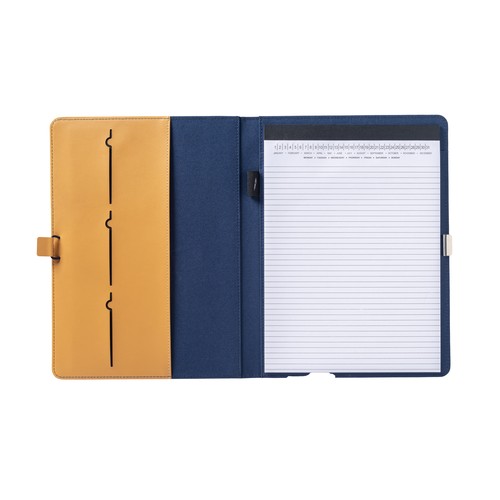A4 padfolio made of R-PET with metal closing hook. 20-sheet ruled pad included. Side document and business card compartments, elastic pen loop inside
