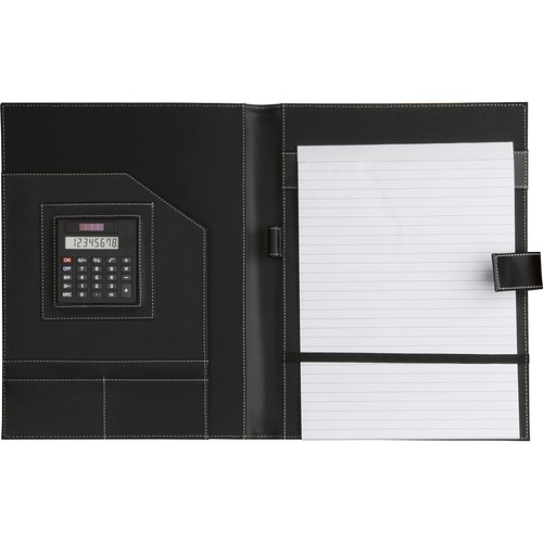 The PU and PVC clipboard folder (Q24136) is the ideal accessory for those seeking practicality and style in the office or during meetings.Equipped with an A4 notepad, an 8-digit dual power calculator, internal business card pockets, and an internal document pocket, this folder offers a complete solution for organizing daily work.Made of PU and PVC, the folder features a magnetic closure that ensures security and ease of use, making it a functional and high-quality accessory.The folder can be customized with screen printing, ideal for flat color logos.
