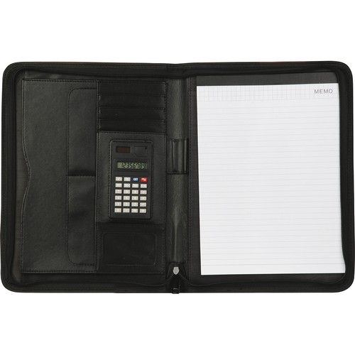The PVC clipboard folder (Q24137) is the ideal accessory for those seeking practicality and organization in the office or during meetings.Equipped with an A4 notepad, an 8-digit dual power calculator, and internal pockets for business cards and documents, this folder offers a complete solution for managing daily work efficiently.Made of PVC, the folder features a zip closure that ensures security and order, making it a functional and durable accessory.The folder can be customized with screen printing, ideal for flat color logos.