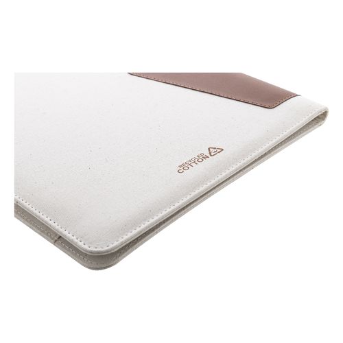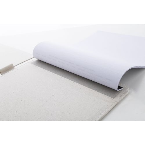 A4 sized, recycled canvas and recycled PU leather document folder with multiple inside organizer pockets. With 20 lined sheets notepad in recycled paper. 70% recycled cotton and 30% RPET polyester.