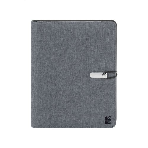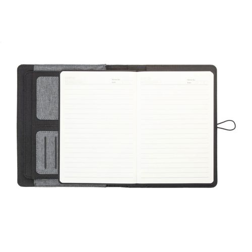 A5 sized, 300D RPET polyester document folder with 64 lined sheets notepad and multiple inside organizer pockets.