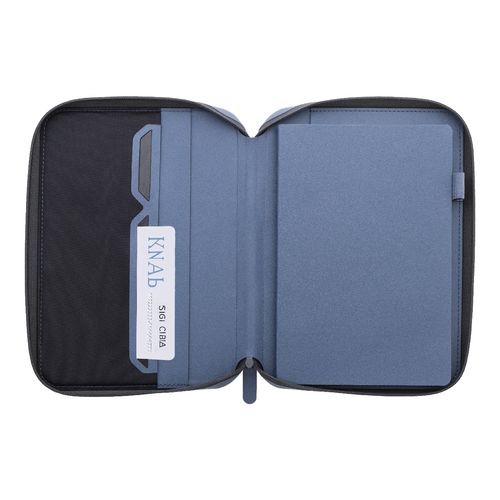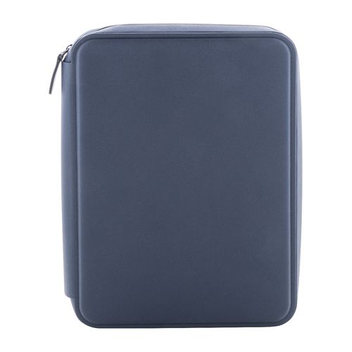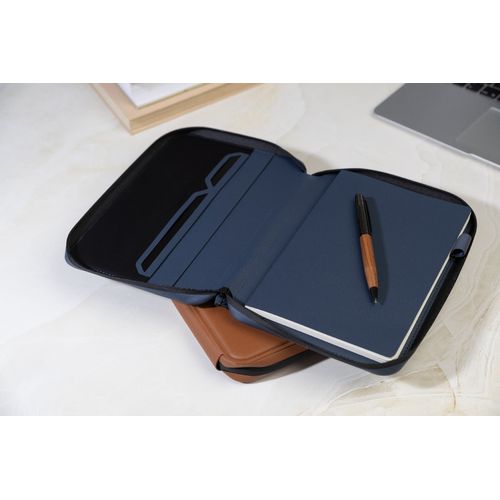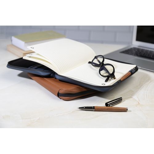Zipped luxury document folder in recycled PU leather, with 64 lined sheets notepad in recycled paper. Featuring multiple interior pockets for cards and documents. A5 size.