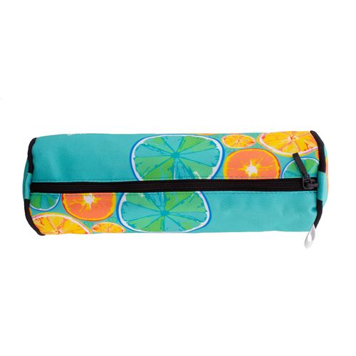 Custom made, round shaped zipped pen case in 600D RPET polyester. With all over sublimation printed graphics and distinctive RPET label. MOQ: 50 pcs.