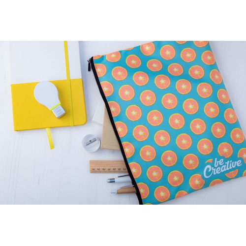 Custom made, zipped document folder in polyester. With all over sublimation printed graphics. A4 size. MOQ: 25 pcs.