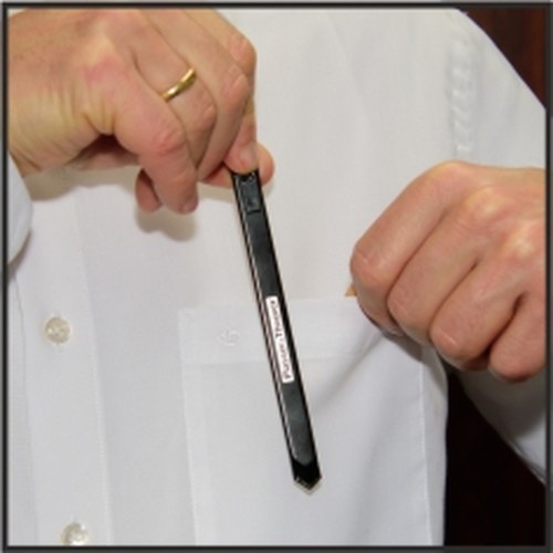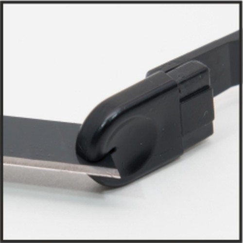 Slim black knife in metal case in the form of a pen with a robust clip.Black SK2H snap-off blades in high quality made of carbon steel for unexcelled cutting sharpnessand long life.Inside a black stainless steel rail 430 with return stop, the blade locks precisely in each position.Blade extension up to 65mm, end cap to break off the blade elements