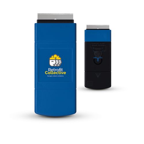 With its interchangeable razor blade, this retractable scraper is ideal for removing labels and material residues. Branding 1 Colour or Quadri-Digital.