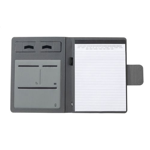 A4 sized, 300D RPET polyester document folder with built-in magnetic wireless fast charger (10W), 5000 mAh power bank with USB charger port, foldable mobile holder and 20 lined sheets notepad. Including self-adhesive metal ring to use the magnetic function on any wirelessly chargeable device. Including USB charger cable.