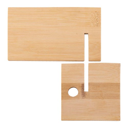 Support made of bamboo, includes two interlocking pieces very easy to assemble. With hole for the charging cable.