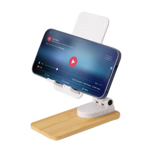 Foldable, adjustable desk mobile holder in ecological wheat straw plastic and bamboo.