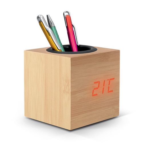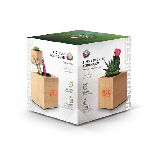 A mini plant, pencils, make-up brushes, jewellery... your small items or your alarm, this Nordic-style clock can multitask! Multifunctional alarm clock and holder. Noise-responsive display with time, date, temperature, and 3 programmable alarms. Works with 3 AAA batteries (not provided) or the USB cable provided. Delivered in an individual illustrated box. Branding on 1 or 2 sides in 1 Colour, Laser engraving, Quadri-Digital or Nominative Quadri-Digital.