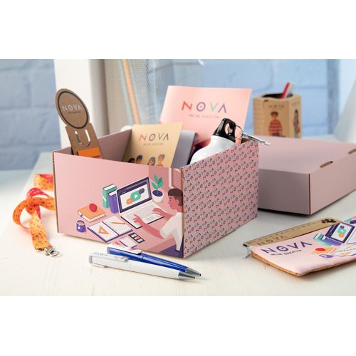 Custom made, full colour printed corrugated cardboard lid-bottom box. Delivered flat-packed. MOQ: 50 pcs.