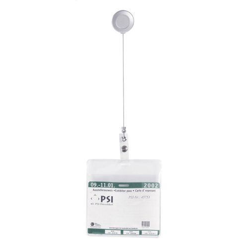 Plastic badge holder with press-stud closure, telescopic line and metal clip.