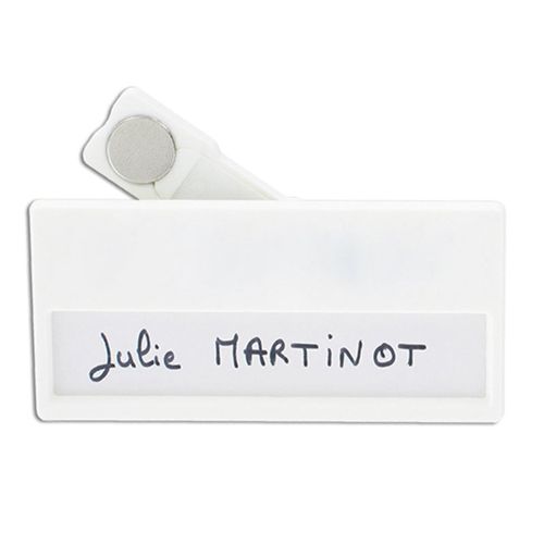 Label holder badge with cardboard label and plastic cover, with magnetic fixing on the back. Opaque white. Label dimensions: 65x28 mm, visible area : 63x14 mm. Delivered in batch of 10 individual bags. Branding above the label area in 1 Colour or more, Quadri-Digital or Nominative Quadri-Digital.