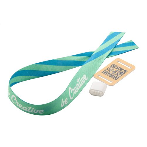 Custom made, polyester festival bracelet with plastic safety lock and full colour printed plastic plate. With sublimation printed graphics on both sides. MOQ: 100 pcs.