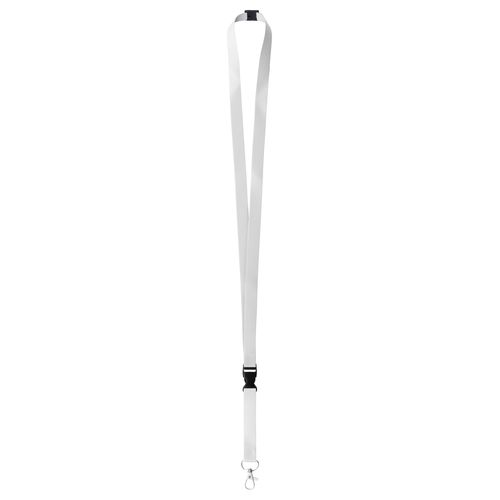 Custom made, 15 mm wide polyester lanyard with detachable metal carabiner and safety buckle. With sublimation printed graphics on both sides. MOQ: 100 pcs.