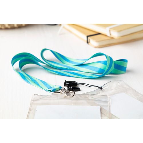 Custom made, polyester lanyard with metal carabiner and mobile string. With sublimation printed graphics on both sides. MOQ: 100 pcs.