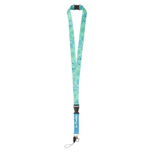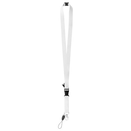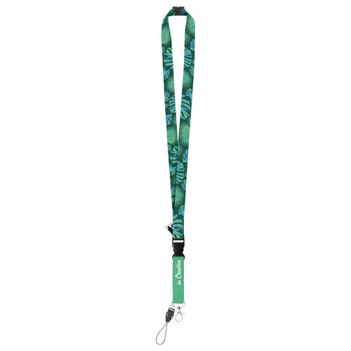 Custom made, RPET lanyard with detachable metal carabiner, mobile string and safety buckle. With sublimation printed graphics on both sides. MOQ: 100 pcs.