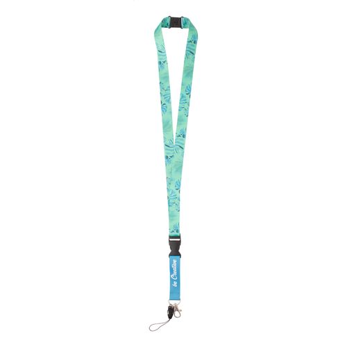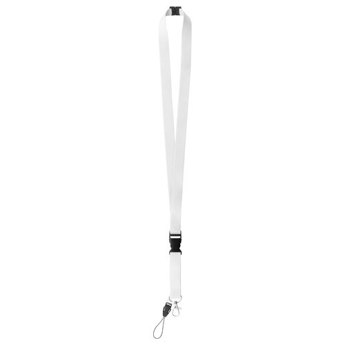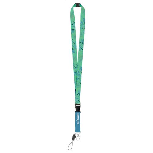 Custom made, polyester lanyard with detachable metal carabiner, mobile string and safety buckle. With sublimation printed graphics on both sides. MOQ: 100 pcs.